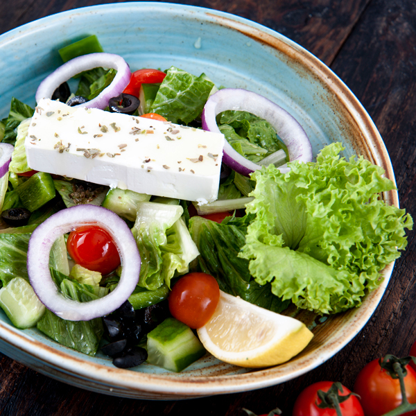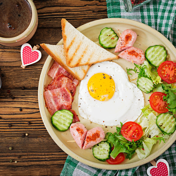 نقانق ورقائق اللحم المقدد والخبز المحمص بالإضافة إلى البيض والمربى تقدم مع الخضروات وجبنة الفيتا.