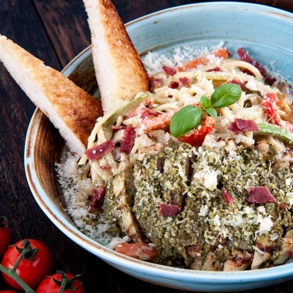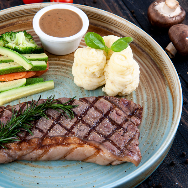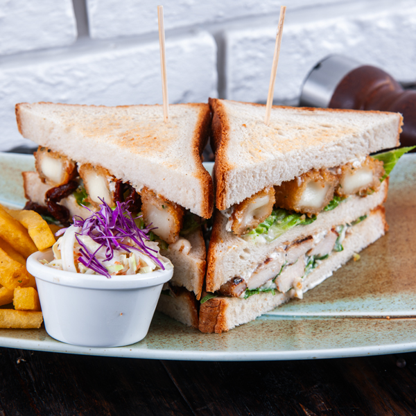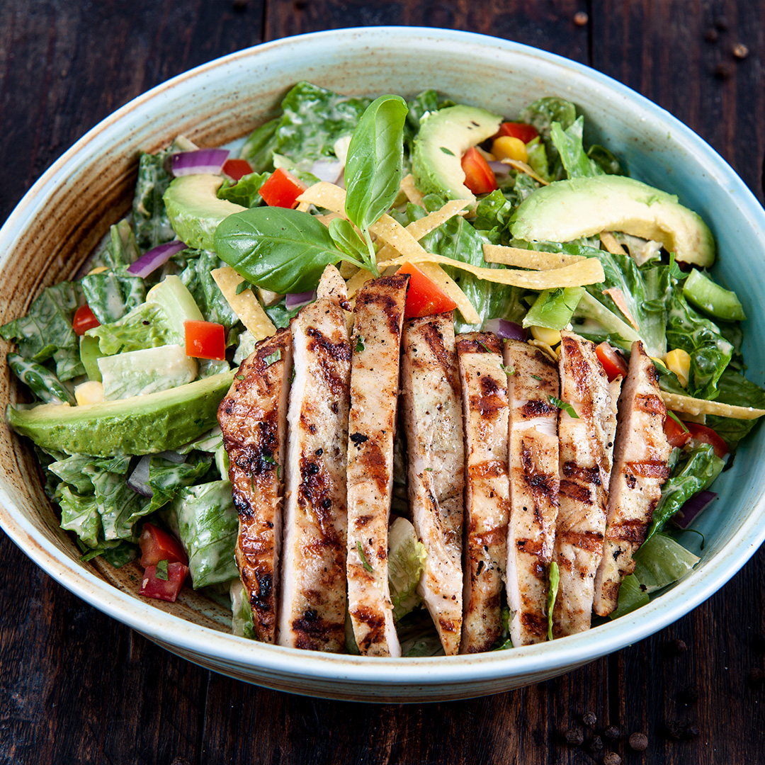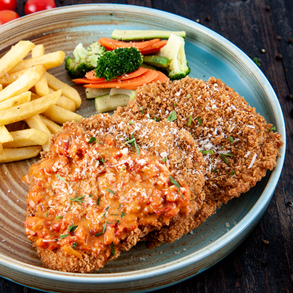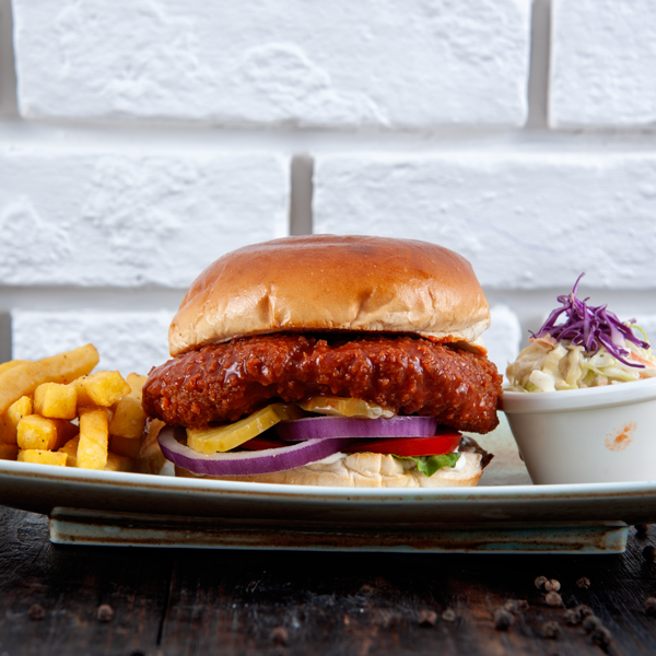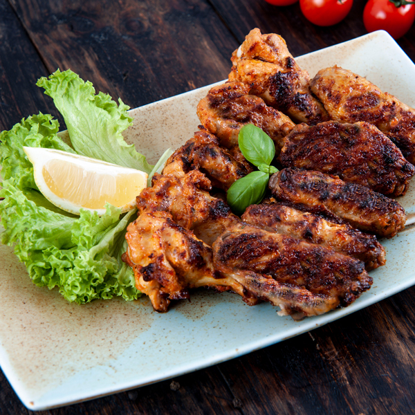 قطع من صدر الدجاج الطري مغلفة بخليط من الخبز و متبله بصوص البوفالو الحارة تقدم مع صوص الرانش.