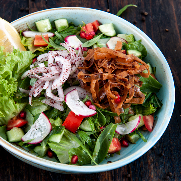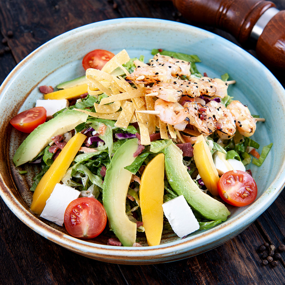 يقدم الروبيان المقرمش في صلصة حارة على طبقة لذيذة من الخس.