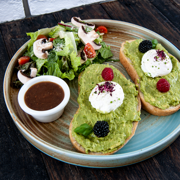 Sour dough, mashed avocado topped with poached egg.
