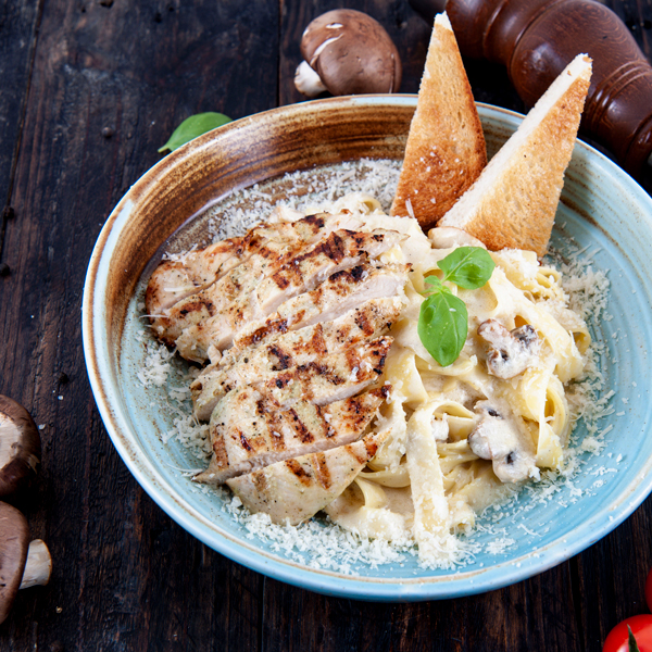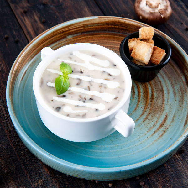 شوربة فطر بالكريمة تقدم مع الخبز المحمص.