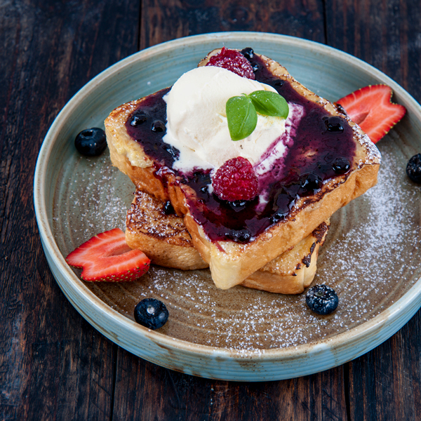 French toast, raspberry jam, fresh strawberry, Served with ice cream.