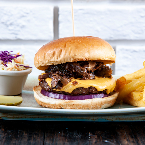 خبزة محمصــة مــع جبن كريمــي مغطــى بالجــرجير وفطــر البورتوبيللــو.