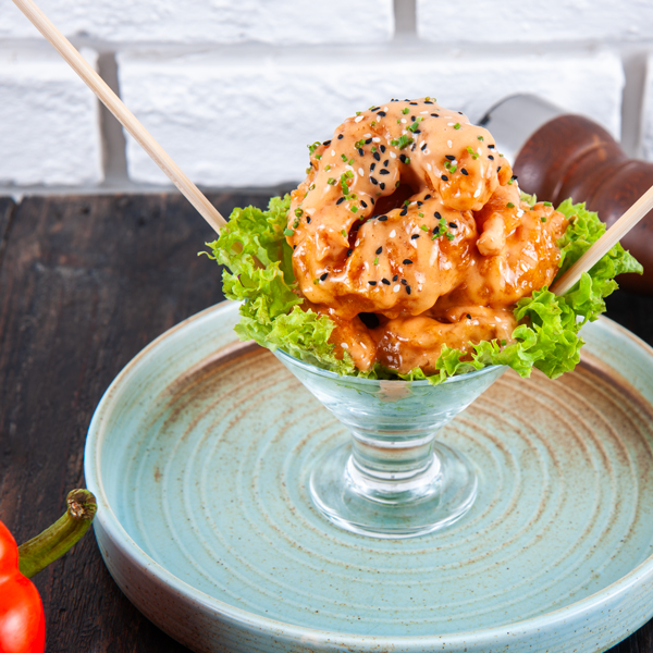Crispy shrimp tossed in spicy sauce laid on bed of lettuce.