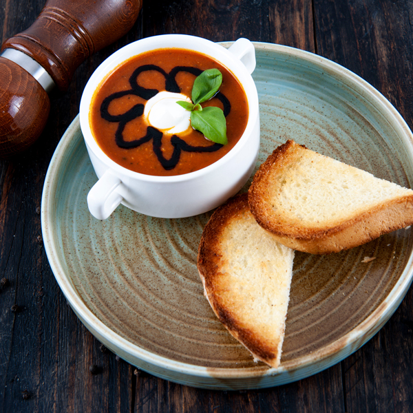 شوربة طماطم مع سور كريم تقدم مع الخبز المحمص.